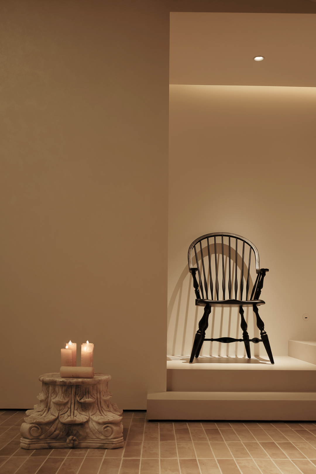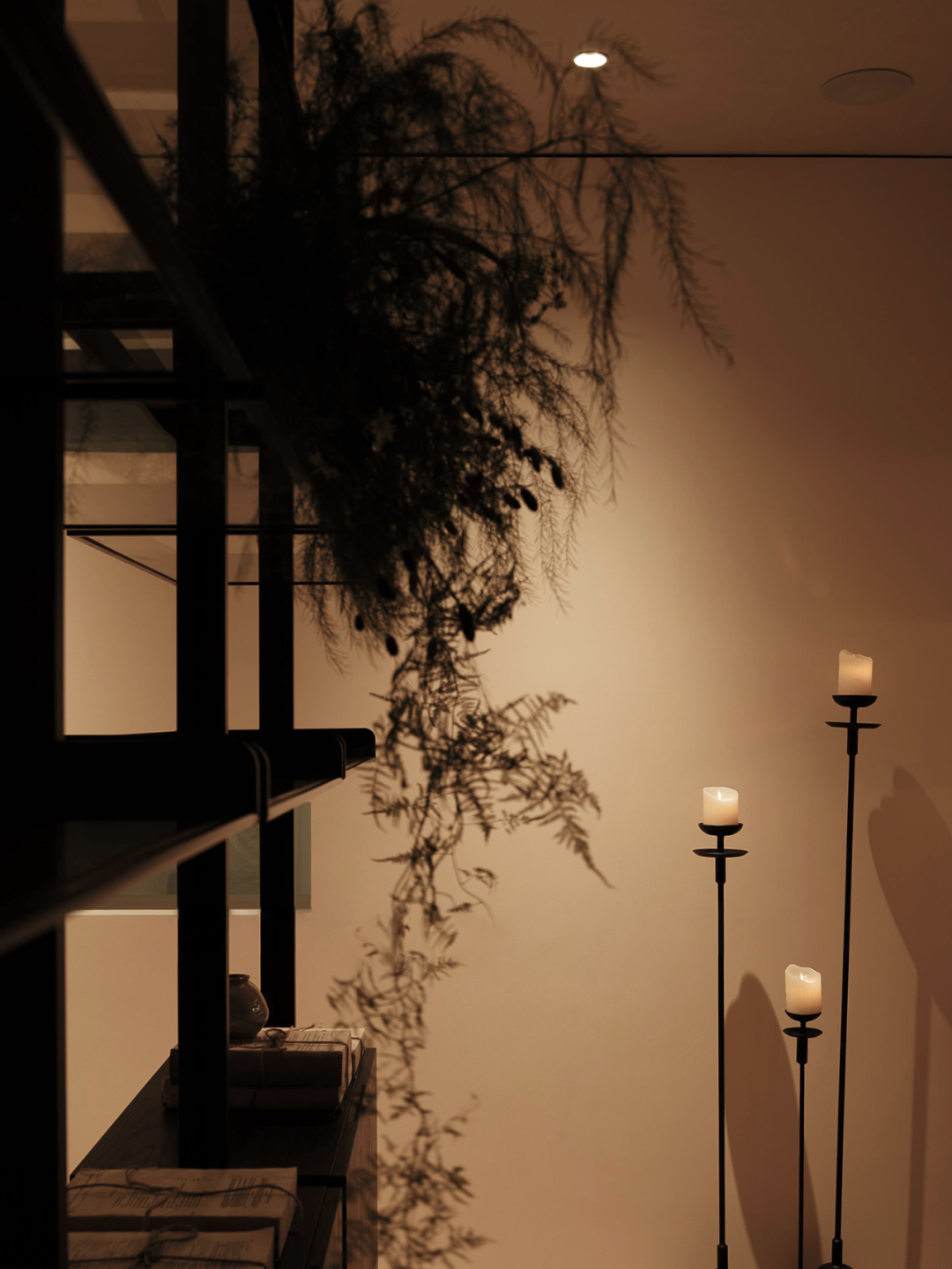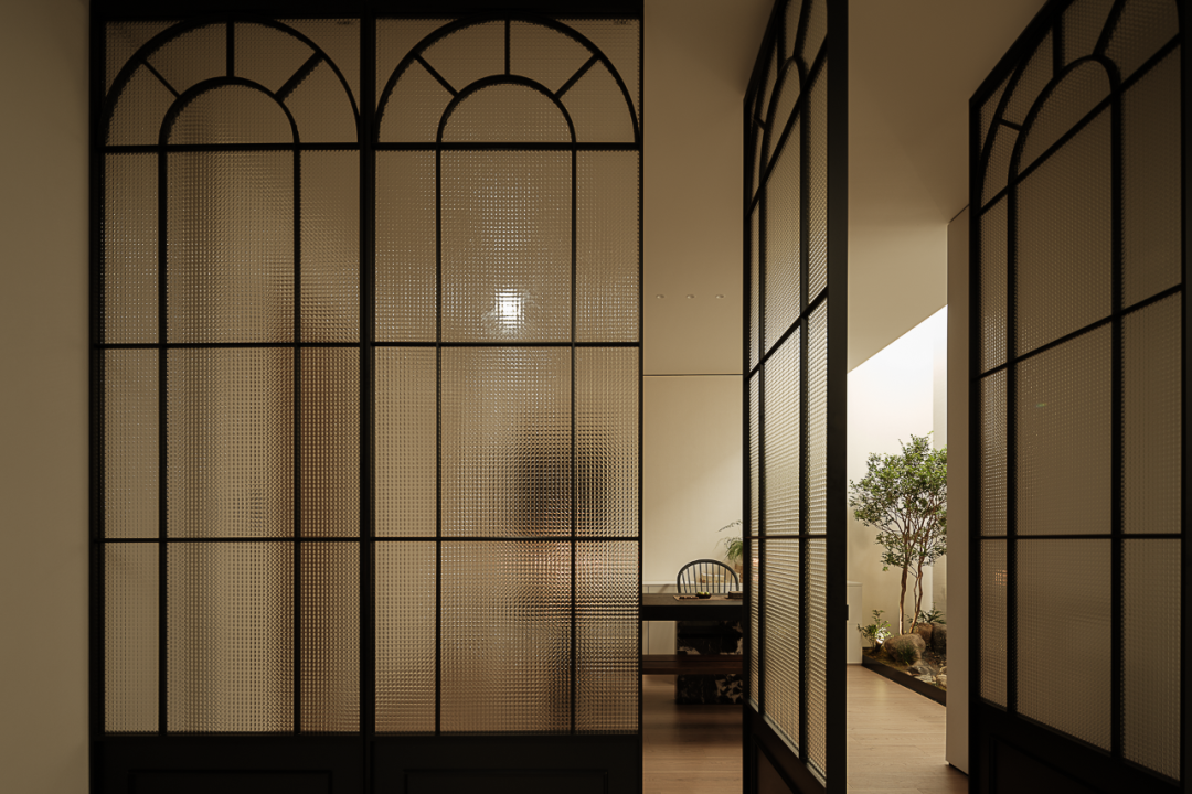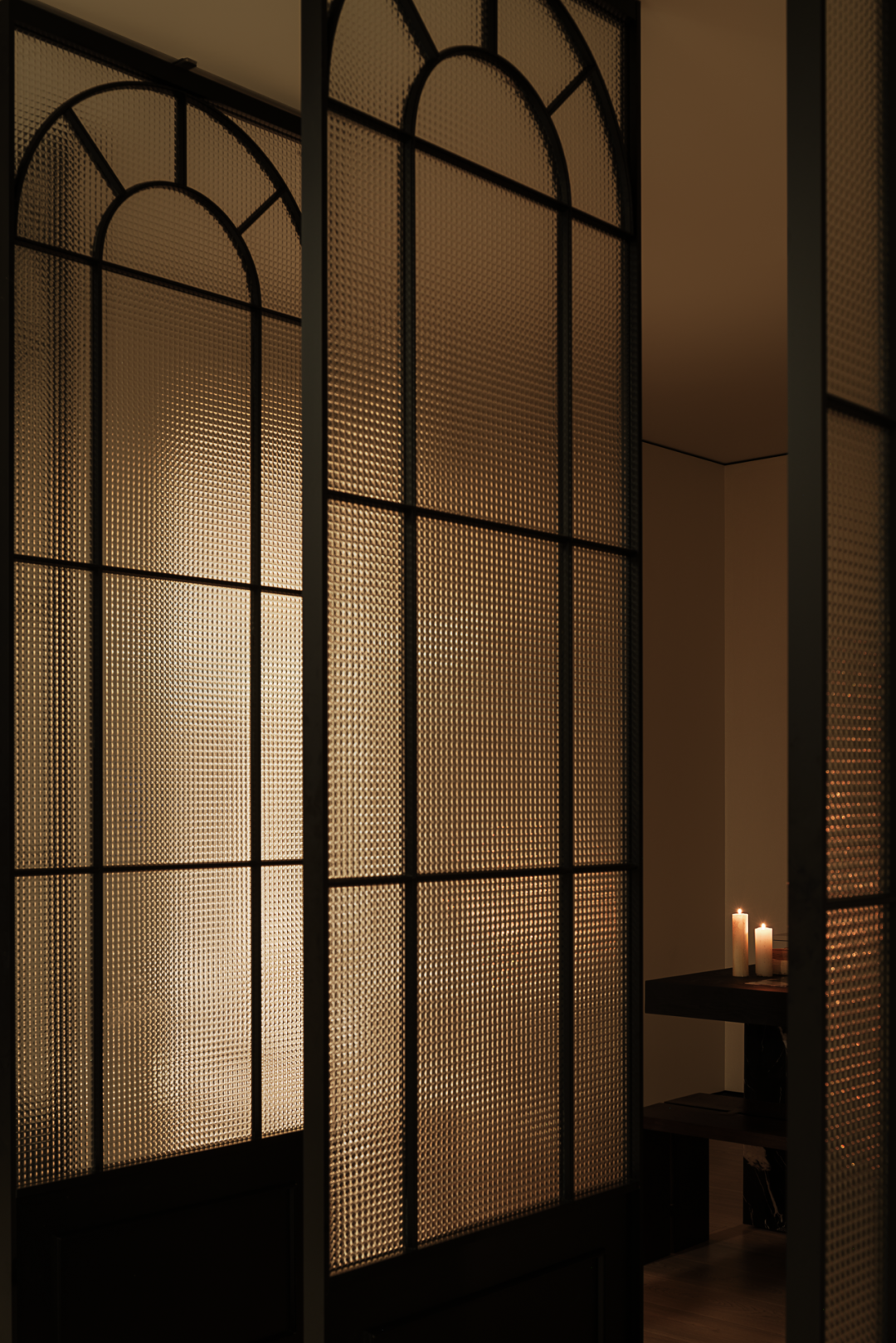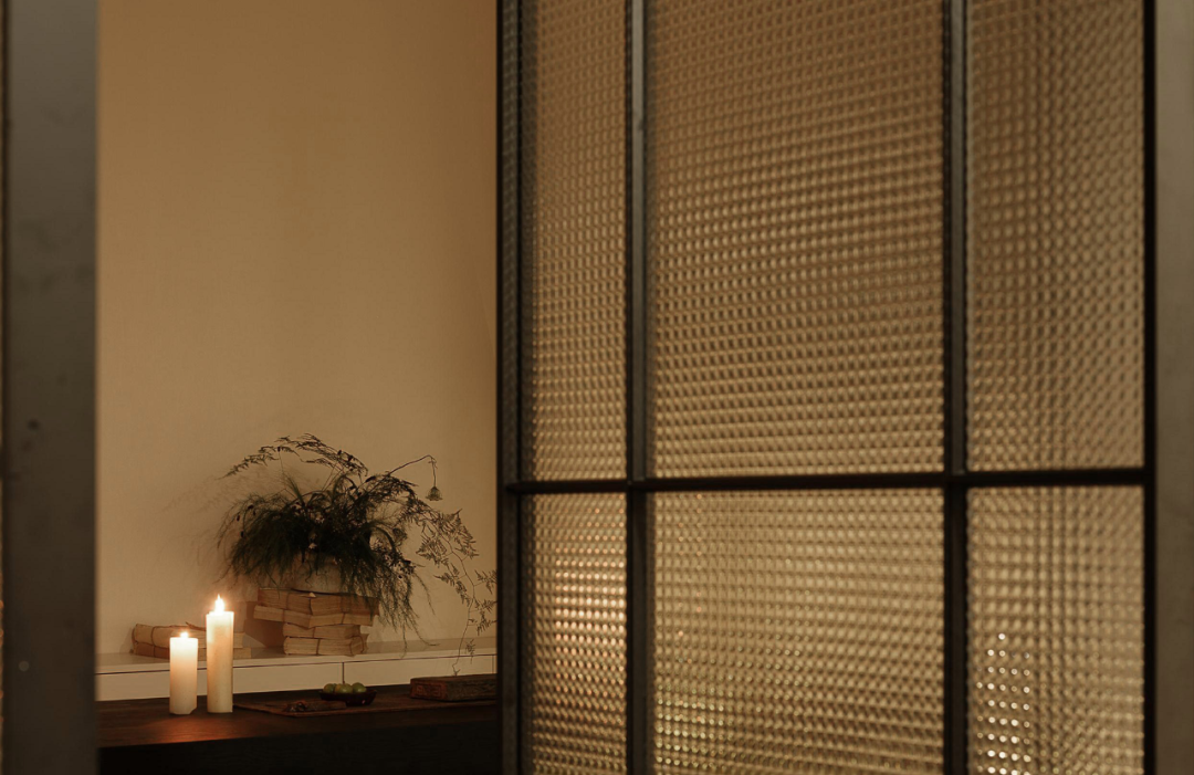 及至后场,设计师利用一隅场地,布置一间茶室,烛光暗淡,影影绰绰。于整体的阴翳氛围之中,局部的“一线天光”倾泻而下,为室内注入能量,植物得以生长。一侧顶天立地的转轴门隔绝着内外,借由光影的勾勒,一扇扇特制的玻璃若波光粼粼的水面,细腻之貌,隐约而生动。