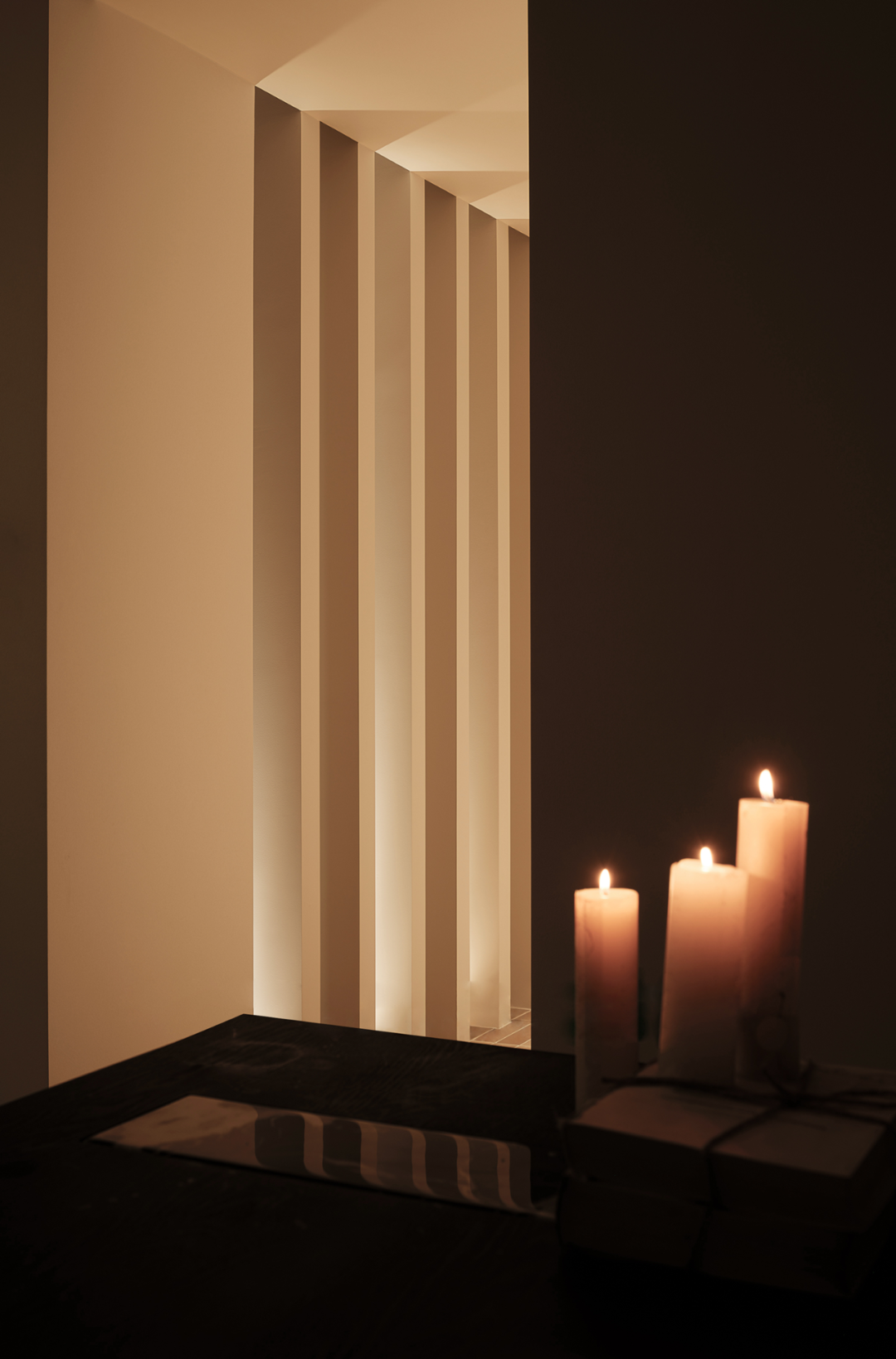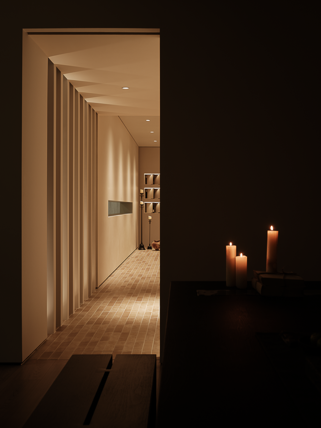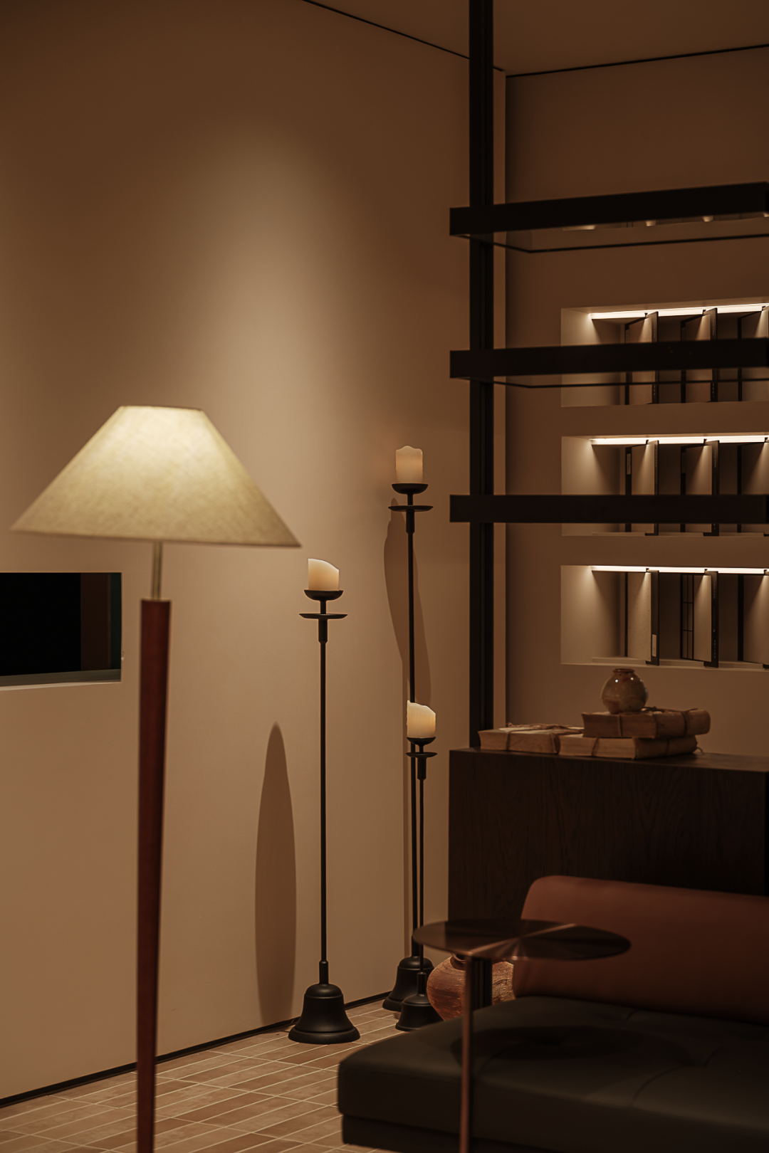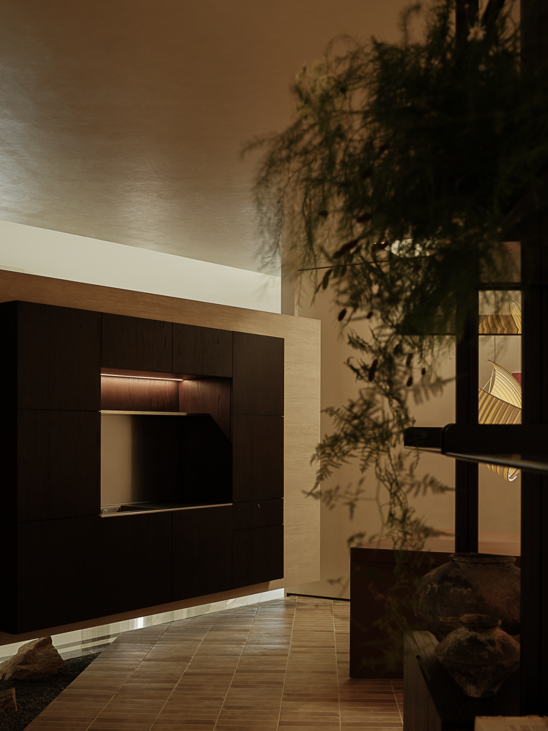 及至后场,设计师利用一隅场地,布置一间茶室,烛光暗淡,影影绰绰。于整体的阴翳氛围之中,局部的“一线天光”倾泻而下,为室内注入能量,植物得以生长。一侧顶天立地的转轴门隔绝着内外,借由光影的勾勒,一扇扇特制的玻璃若波光粼粼的水面,细腻之貌,隐约而生动。