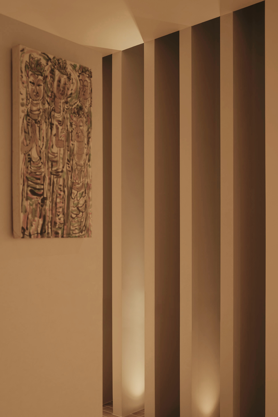 在与通道相临的外墙中空出些许间隙,序列的格栅相隔而立,不仅令内外连续,空气流通,随着时间的变化,访客的行走,也会随机产生有趣的光影效果。