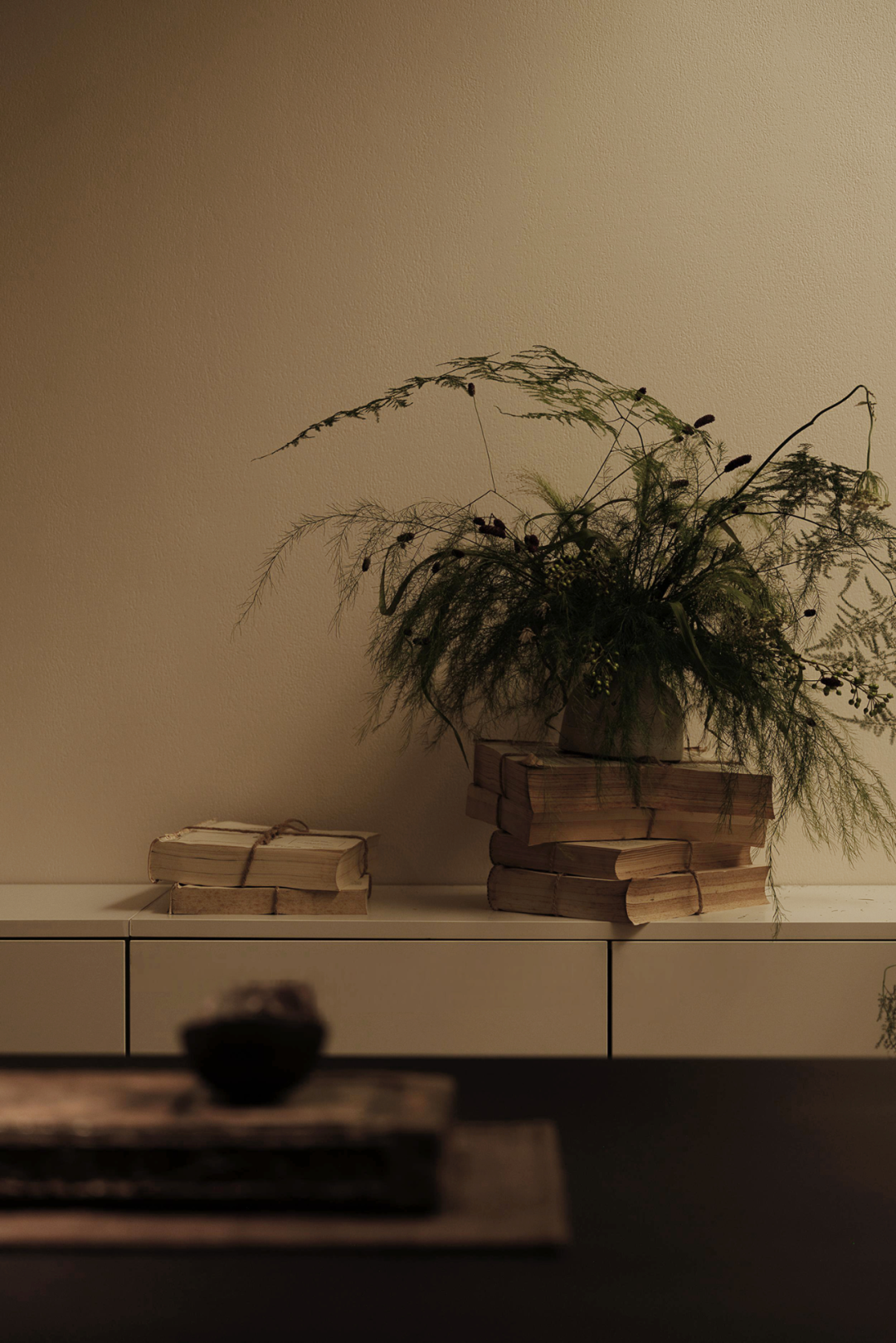 平台之上,阴角之处,一个独具创意的花艺装置自由伸展,其无序的枝条姿态通过有序的人为约束,呈现了另一种生命的张力,寓意自然。