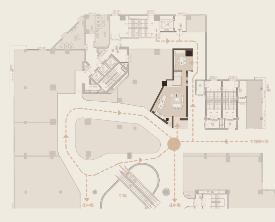 项目位于万饰城内B馆三层的一处“十字路口”,极不规则的展厅平面让设计师不得不摒弃常规的思考模式,在看似杂乱无章的原始结构里,寻求一种因势利导的方法,建立有迹可循的内在秩序,尤为重要。于是,设计师以现场三根大小不一的立柱为锚点,构筑一场关于在交错中互为回响的感知之旅。