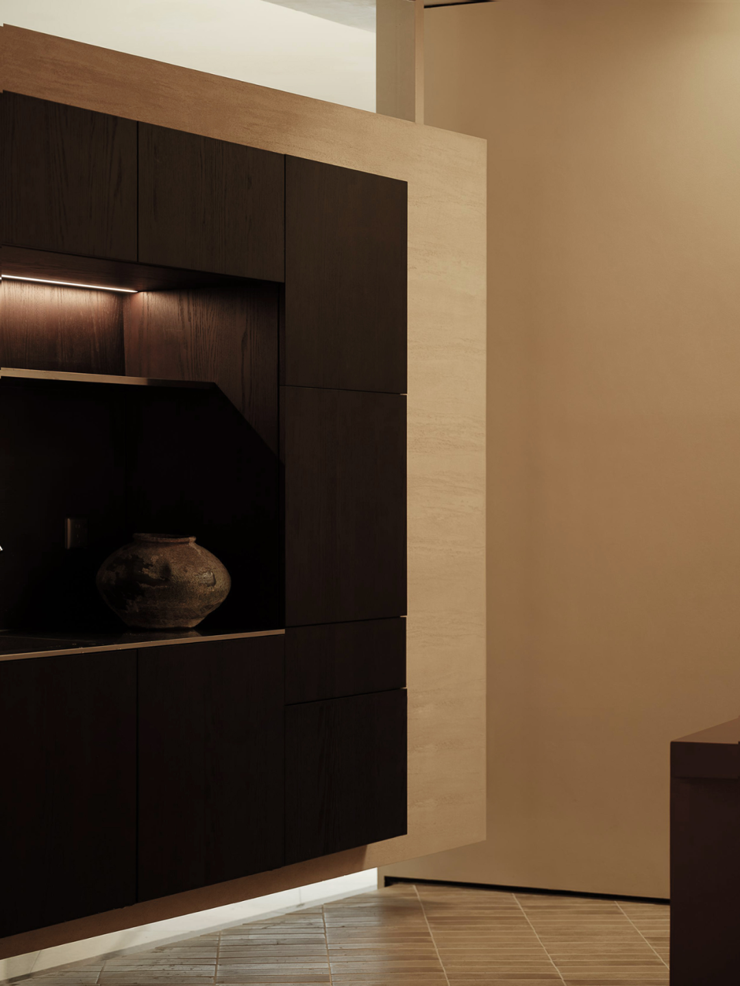 与“客厅”相协调的是“餐厅”——包含一个异型的低饱和度纯色的独立“岛台”和一组嵌入墙体的橱柜系统,满足平日的来宾接待,以及选材时所需的操作空间。二者组合,互为补充,构成展厅内最主要的功能区域,聚集人气。