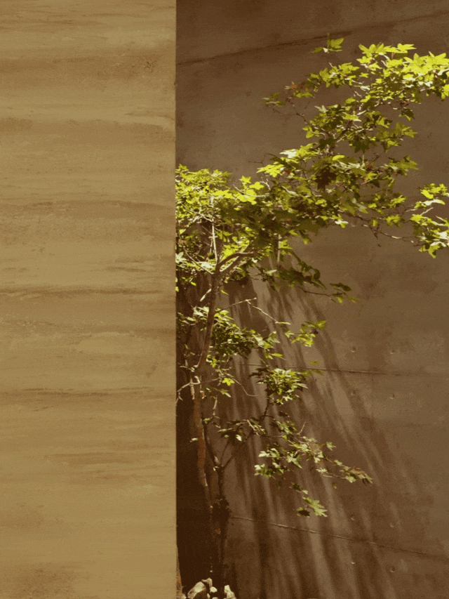 缝隙产生光,亦产生流动。立面借由墙体之间的留缝,让空间隔而不断,共同指向的衔接之处,一颗海岛石枫从地面生长而出,葱茏的绿意形成软的界面,柔化片墙给人的坚硬感。