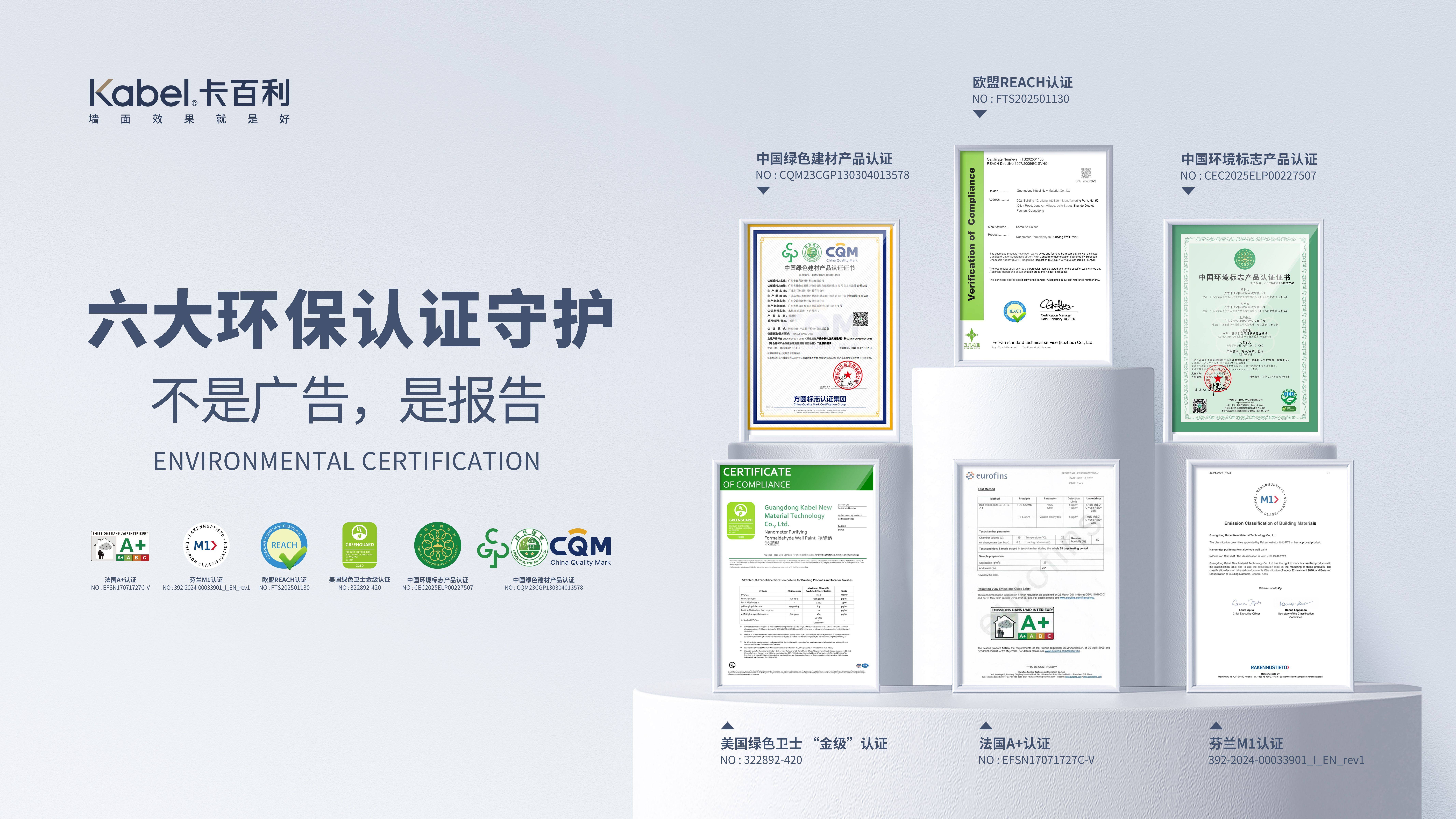 据了解,卡百利始终秉持绿色环保理念,持续加大研发投入,致力于打造健康、安全、环保的优质产品。我们的产品已通过多项国际权威认证,包括美国绿色卫士金级认证、法国A+、芬兰M1、欧盟Reach、绿色建材认证以及中国十环认证,严格遵循高标准环保要求,为客户提供可靠保障。