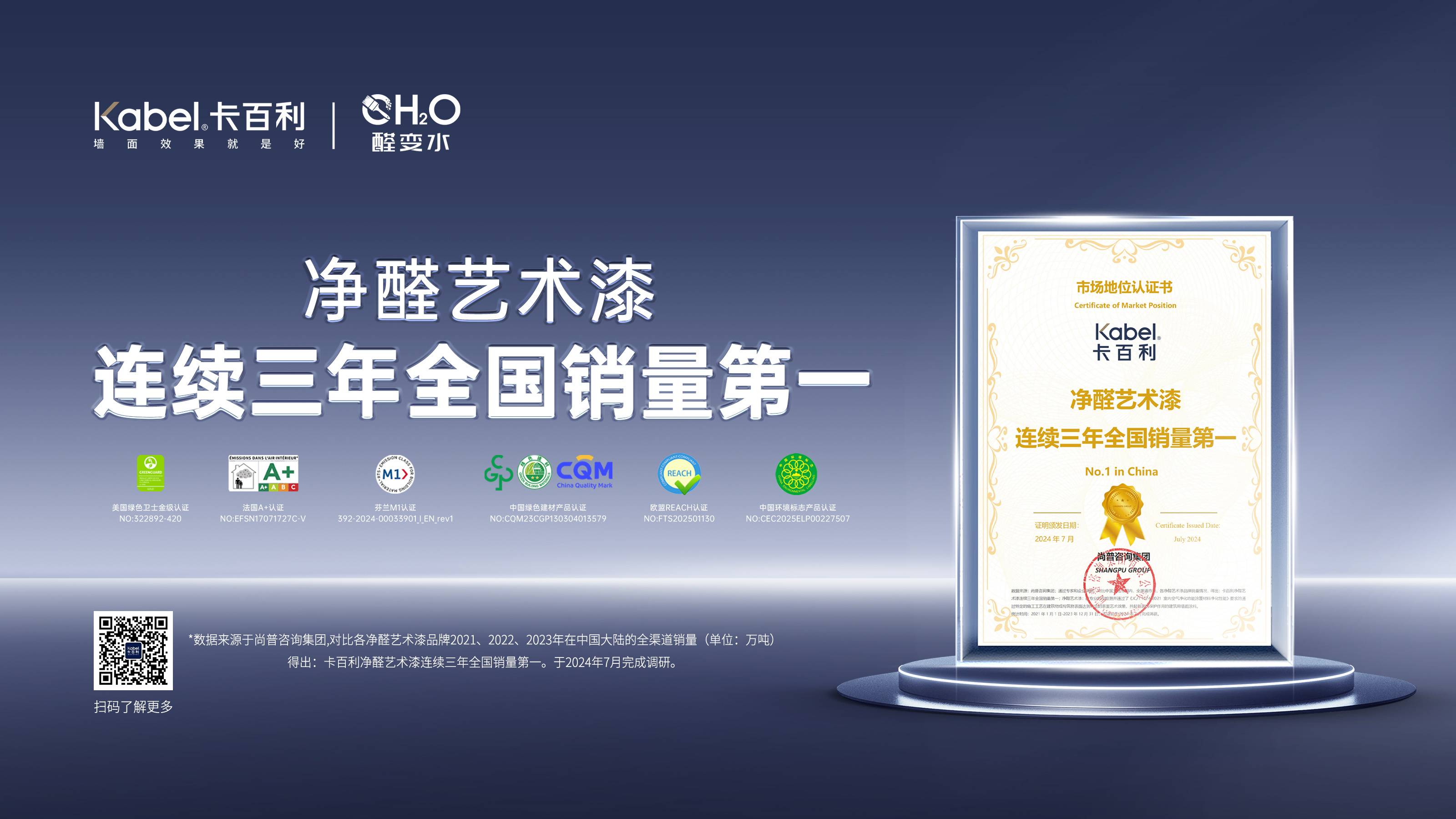 卡百利作为国际化高端艺术涂料品牌,已在全国布局超过1200家经销商与1300家终端门店,累计为百万家庭提供优质的艺术涂料软装服务,深受市场与消费者信赖。据尚普咨询2021-2023年数据调研显示,卡百利净醛艺术漆已连续三年全国销量领先。在品质认证方面,卡百利多款产品获得法国A+、美国绿色卫士金级、芬兰M1、欧盟REACH、中国绿色建材、中国环境标志等权威环保认证,充分印证其在健康环保层面的高标准。