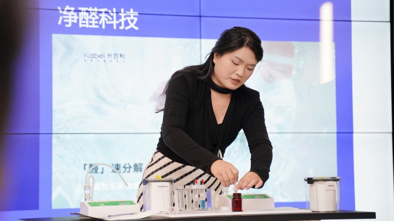 在产品净醛性能测试环节,卡百利的李春晓老师通过一场生动的对比实验,清晰地展示了卡百利产品的净醛效果。在甲醛浓度相同的模拟环境中,卡百利净醛艺术漆与普通乳胶漆的对比实验显示,前者凭借“醛变水”技术,展现出持续吸附并分解甲醛的能力。据了解,目前卡百利全线产品均已应用“醛变水”技术,具有长效吸附与降解甲醛的功能,实现“即刷即住”的净化效果,让墙面在承载美学功能的同时,也是家居健康的守护层。