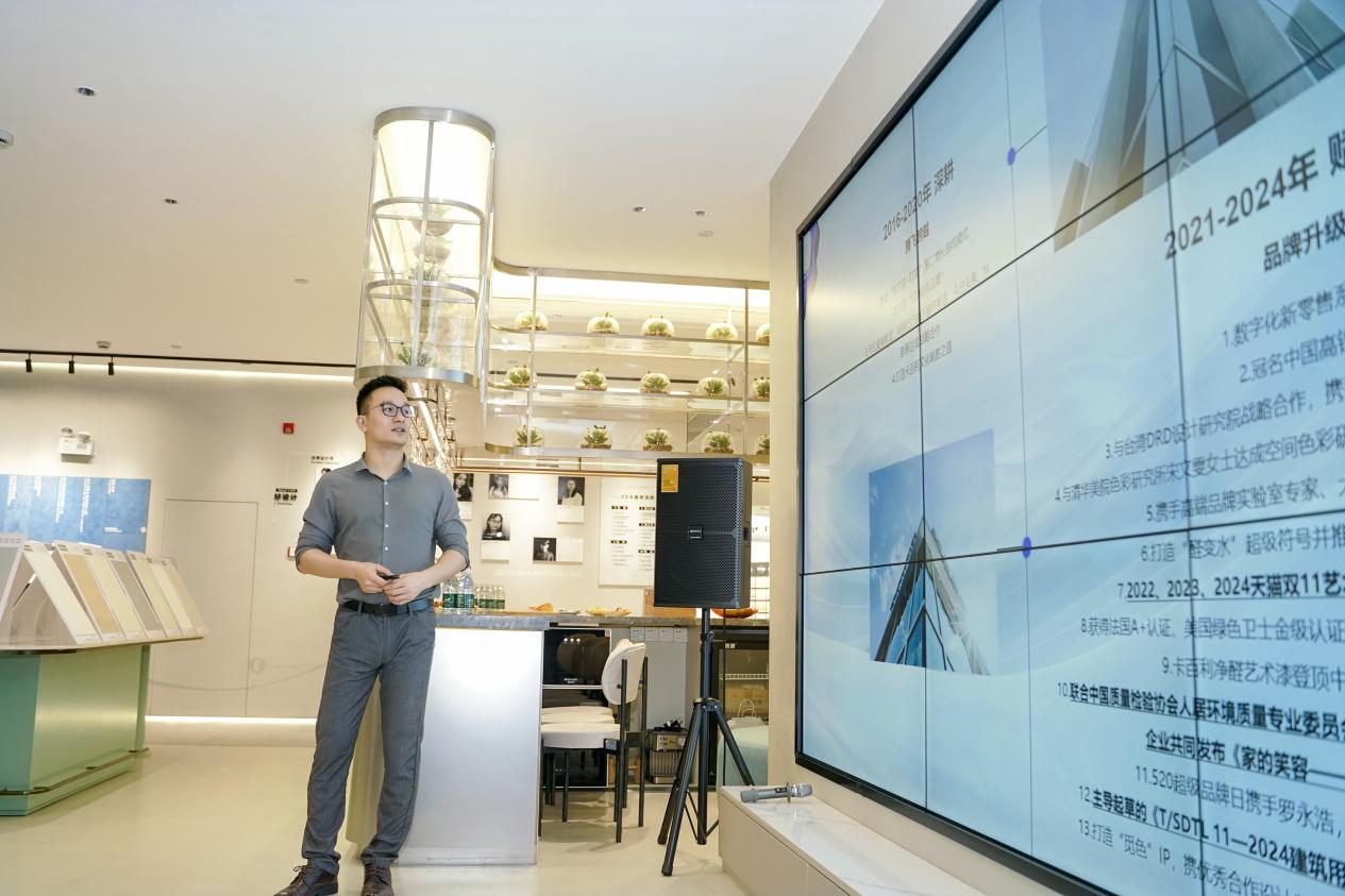 参观结束后,活动进入深度交流环节。卡百利联合创始人兼首席色彩官伍建军围绕品牌理念及产品色彩体系展开分享。他清晰地阐述了卡百利品牌的核心理念及产品体系优势,生动地展示了品牌如何通过“好产品、好色彩、好工艺、好服务”四个维度,为设计师提供强大的创作素材和解决方案。并结合卡百利“梵高”、“马卡龙”、“莫兰迪”、“国潮”四大色彩体系,深入解析了如何运用色彩营造空间氛围,打造出不同风格的家居空间,满足消费者的情绪价值。在场的设计师结合自身设计经验,就色彩的运用及美学价值进行了热烈的探讨。