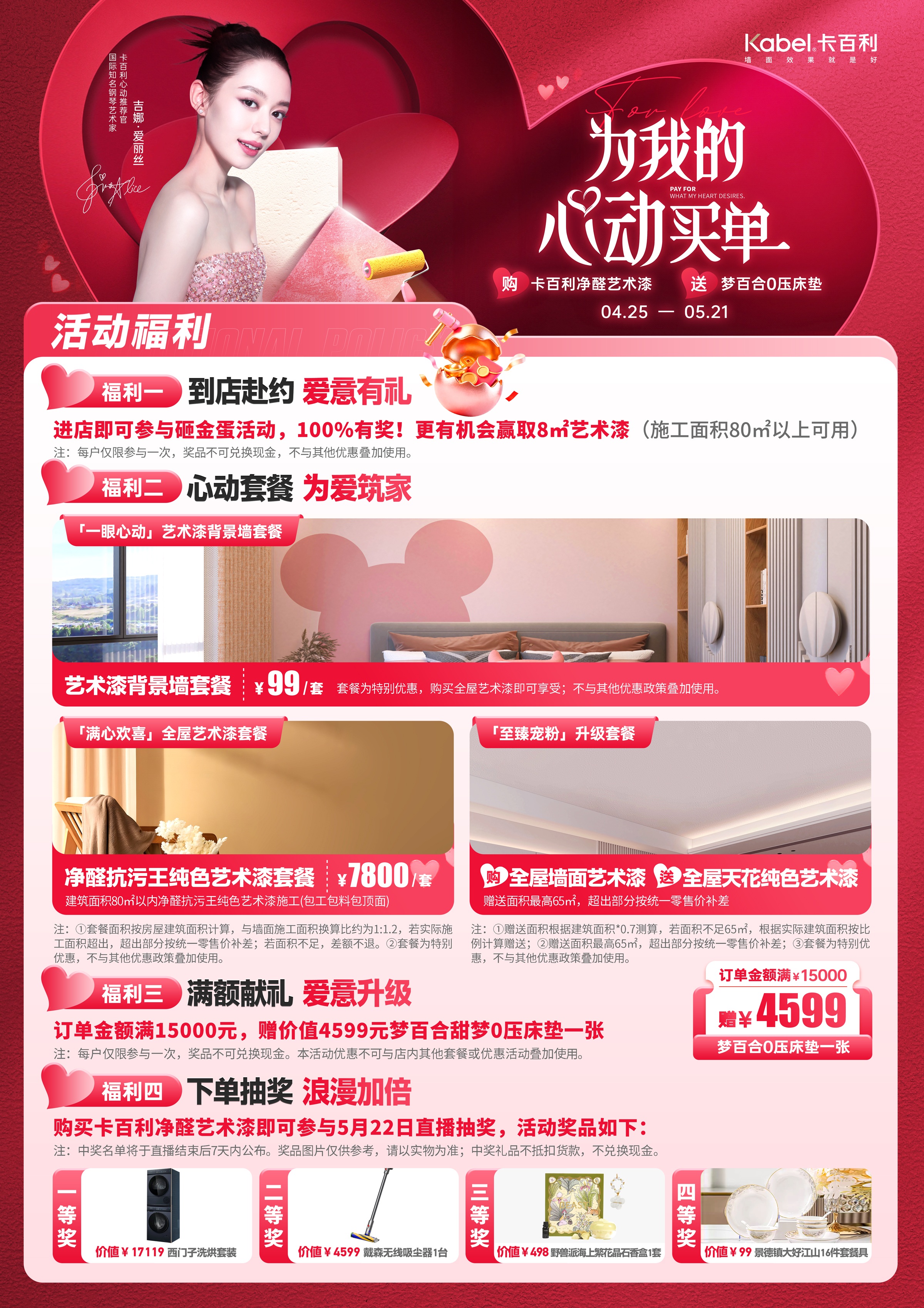 4月25日,卡百利艺术漆正式官宣,国际钢琴艺术家吉娜·爱丽丝担任品牌“心动推荐官”,卡百利520超级品牌日全国联动活动也于4月25日至5月21日同步展开。