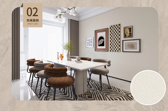 普通艺术漆要么因为漆膜疏松导致污渍渗透,要么因为添加了过多亮面成分影响质感,而卡百利这款通过“紧密漆膜+天然彩砂”的组合,既解决了抗污难题,又保留了艺术漆的素雅质感,这也是其长期使用后依旧美观的关键。