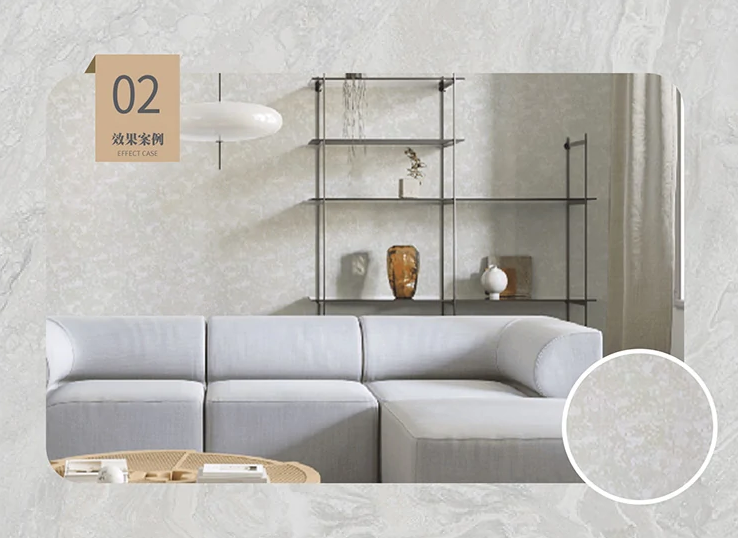 更让人惊喜的是它的珠光幻彩效果。不同光线角度下,墙面会呈现出明暗变化的金属光芒:清晨阳光斜照时,是柔和的珠光色泽;傍晚开暖光灯后,又会透出淡淡的银箔质感,同一面墙能呈现出不同的视觉体验。我选的是莫兰迪色系的浅杏色,搭配这种珠光效果,既保留了家居空间的温馨感,又比普通纯色墙面多了几分精致细节,家里来访的朋友都忍不住夸赞“墙面有格调”。