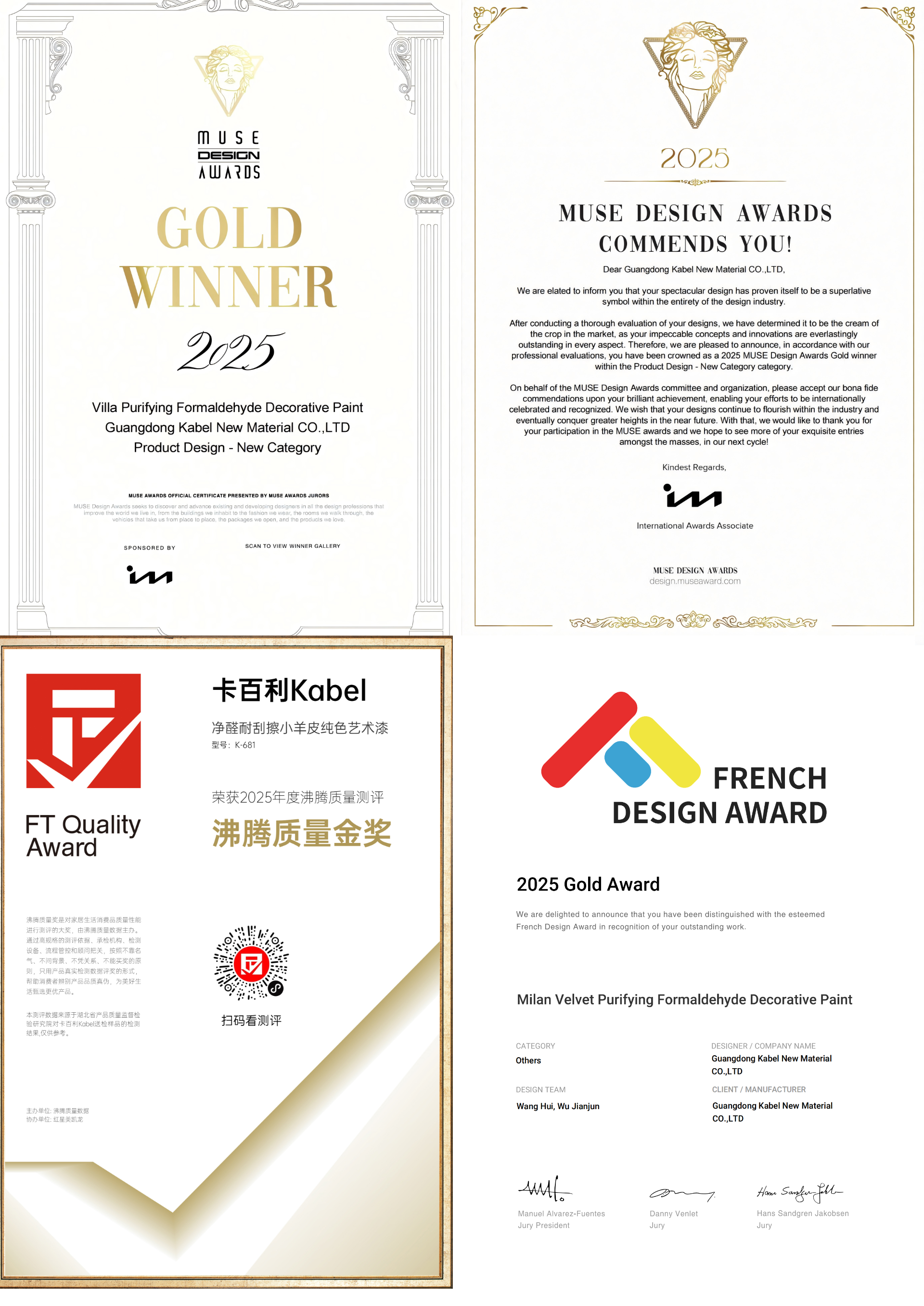 卡百利艺术漆产品具备防水防潮、防霉抗碱、防火耐高温、防静电、耐刮擦、高效祛甲醛环保、抗污易洁、0损耗、易修补、即刷即住、多色可调、吸音降噪等诸多核心特性。例如,其明星单品净醛米兰丝绒荣膺“法国设计奖”金奖,被誉为艺术漆界“一代宗师”;净醛布莱娅荣膺美国“MUSE缪斯设计奖”金奖,拥有美术馆同款墙面效果;耐刮擦小羊皮真实耐刮擦达2万次,荣获2025年度“沸腾质量金奖”。